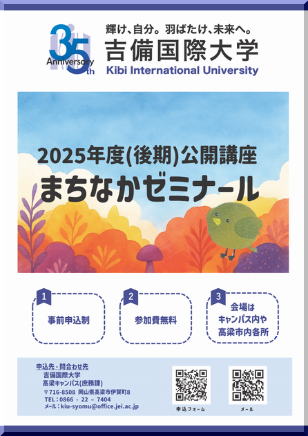 吉備国際大学では、「2025年度(後期)公開講座まちなかゼミナール」を全9回開講します。