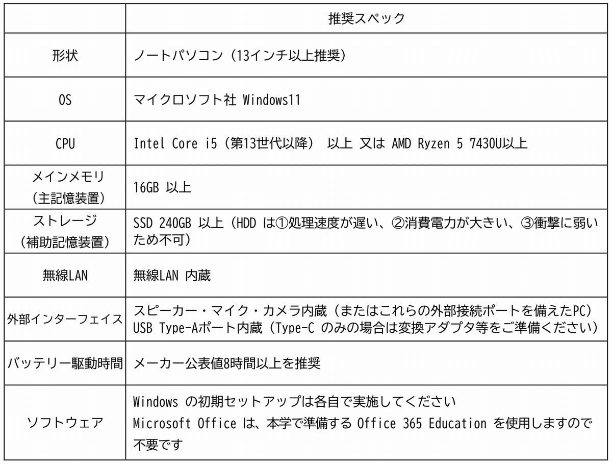 2026 年度新入生向けパソコンの推奨仕様(スペック)