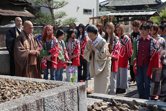 4月26日(土)、岡山市北区にある栄西禅師の生誕地にて、臨済宗建仁寺派管長 小堀泰巌老大師による栄西禅師の御法要を執り行った後、法被姿の外国学科1年生が中心で、浴衣姿の地域住民の皆様と一緒に、およそ50名が石碑のまわりを輪になって、栄西踊りを奉納しました。