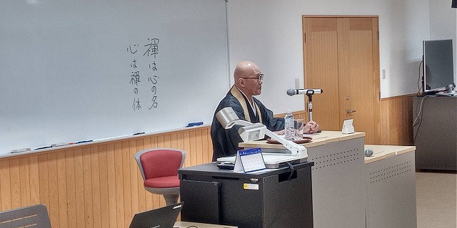 5月7日(水)の「生き方」の授業は、曹源寺ご住職、原田正道先生にご講義いただきました。先生は、月の半分は海外に出張され、岡山にいる間は、海外からの修行僧も含め35人の指導を担われています。海外のお弟子さんには、毎日オンラインで指導されているそうです。