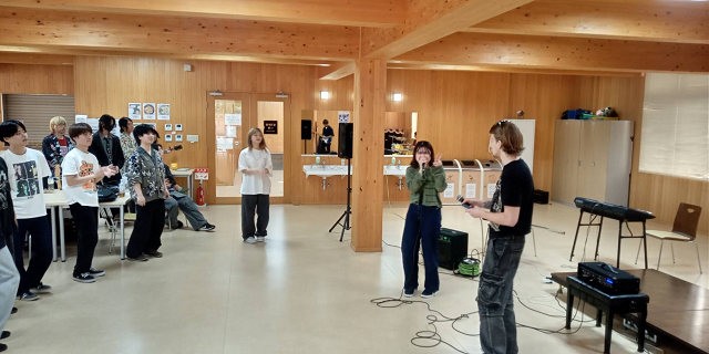 5月31日(土)岡山キャンパスの食堂を会場にして、高梁キャンパス、南あわじ志知キャンパス、岡山キャンパスの軽音部・サークルのメンバーが集合し、3キャンパス合同コンサートを開催しました。応援に来た学生や友人も含め、40名の学生らが参集しました。3キャンパス合同の取組みは、本年3月に、高梁市にある「高梁基督教会堂」で開催した卒業コンサートに続くものです。