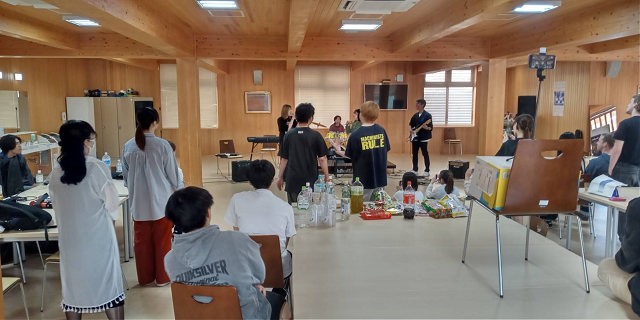 2時間半で、すべての演奏が終了しました。コンサート終了後、3キャンパスの軽音部・サークル関係者で、交流会を行いました。ドラム、ベース、ボーカルなどのパートごとの交流会となりました。同じパートのメンバー同士、共通の話題があり、演奏して楽しい経験、技術向上のための練習方法、他のパートとのあわせの苦労など車座で話し合っていました。他キャンパスの学生さらに留学生も参加しての交流は新鮮で、学びも多いです。学生たちは、音楽という共通の関心があり、初対面同士でもコミュニケーションはスムーズでした。