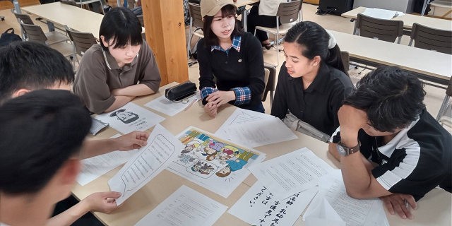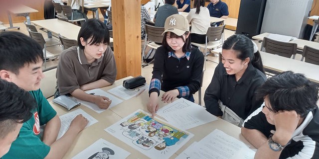 金曜日3時限目に、1年生対象の専門教育科目「異文化理解」があります。6月20日は、第10回授業でしたが、第5回授業に引き続き、タンザニアやタイでの勤務経験のある横山明子さんに講師として来ていただき、ワークショップをしていただきました。テーマは「多文化防災」です。90分間の授業ですが、ロールプレイをして講師の課題に取り組みます。なぜだ?どうして?36名の学生(うち日本人学生は18名)は大いに議論して、グループの意見を取りまとめます。多文化共生社会の基本である、異文化理解の神髄に触れることができました。今回の授業には、カナダ・オカナガン大学からの夏季研修団学生4名、留学生別科の学生6名が特別ゲストで参加してくれました。