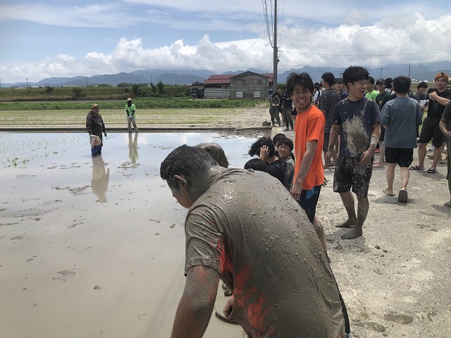 実習農場の水田に、参加者らは裸足で入り、丁寧に苗を手で植えていきました。苗を植えた後は、例年恒例となっている泥相撲大会が行われ、大変な盛り上がりを見せました