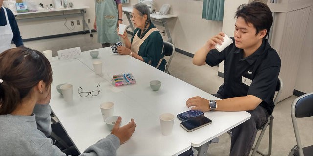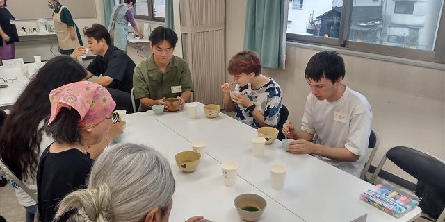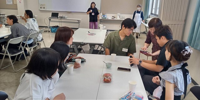 冒頭、岡輝公民館から開会のあいさつがありました。そして、世界のお月見を学ぶコーナーが始まりました。国ごとのブースを設け、参加者がそれぞれのブースを回り、お月見の習慣などを学びました。お月見団子をいただきながら、各国のお茶をいただくのは楽しい、得難い経験でした。留学生のみなさんは、日本のお月見を学びながら、自国のお月見の説明をし、楽しい時間を過ごしました。日本の抹茶、中国の「白茶」、台湾の「ウーロン茶」、ベトナムの「ジャスミン茶」、スリランカの「紅茶」をそれぞれいただきました。香りの違い、味の違いを満喫しました。いろいろな話で盛り上がりましたが、「中国の月餅は、北部は小さいが、南に下れば下るほど大きくなる。大きいものは、ラージサイズのピザと同じくらい」という、中国人留学生の話にみなさんが驚かれていました。そして、中国、台湾、ベトナムのみなさんは、お月見には月餅を食べるそうで、文化的共通点がありました。インドネシアではお月見は一般的ではありませんが、中国系コミュニティではお月見をするそうです。
