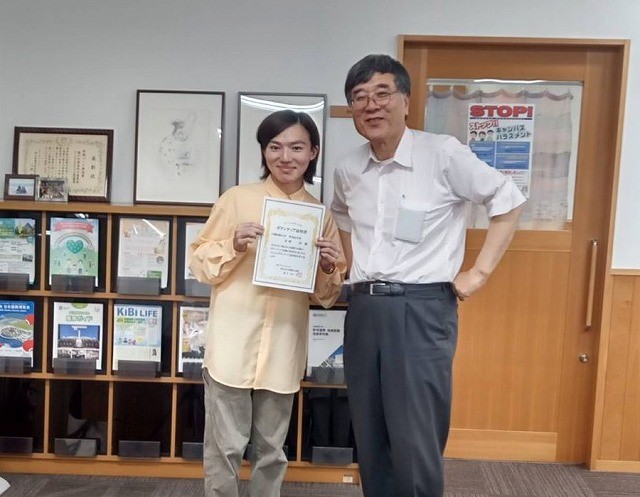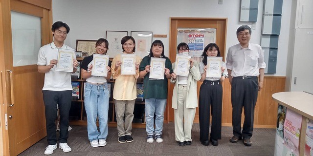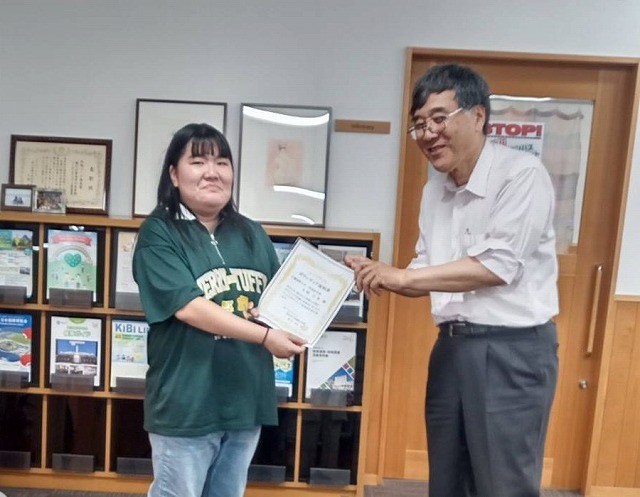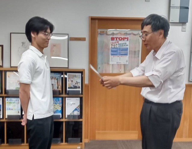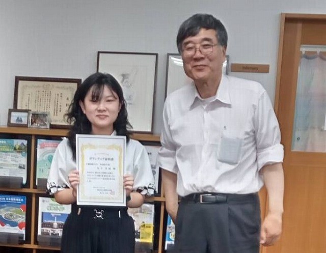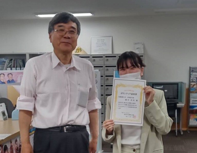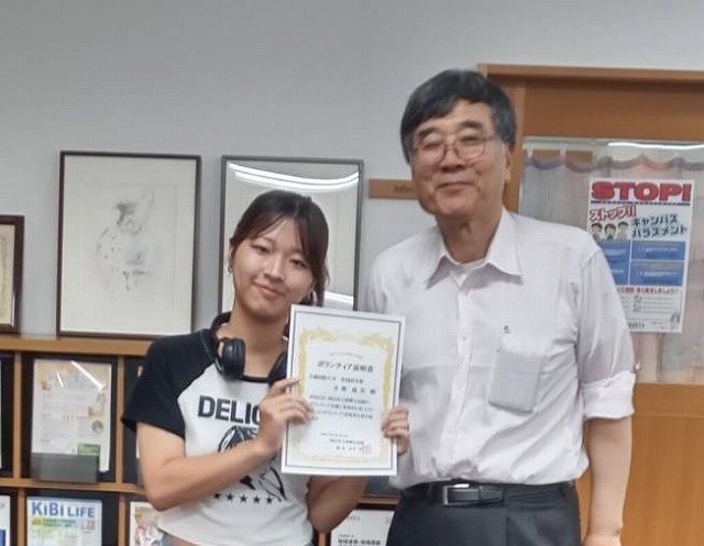 【外国学科】岡輝公民館長から学生へ「ボランティア証」が授与されました