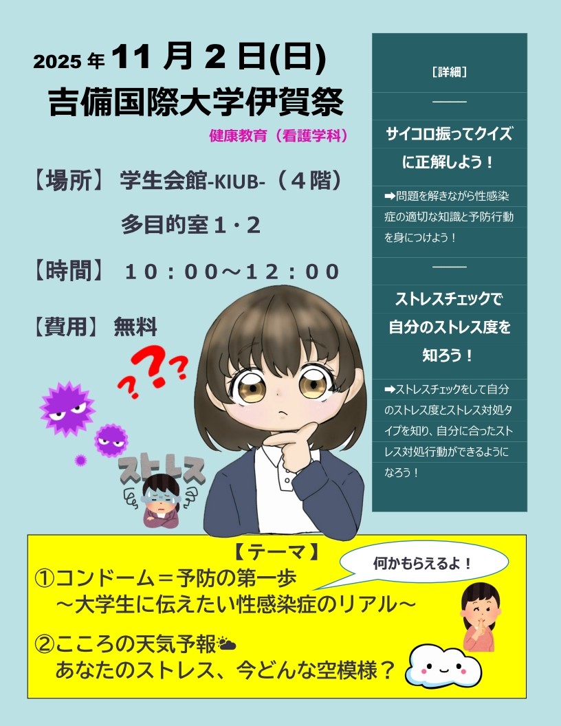 看護学科4年生(保健師課程)は、実習の一環として、伊賀祭(高梁キャンパス学園祭)開催中の11月2日(日)に「健康教育」を行います。