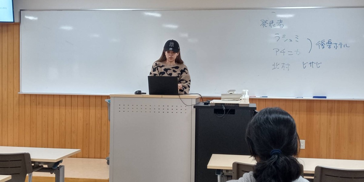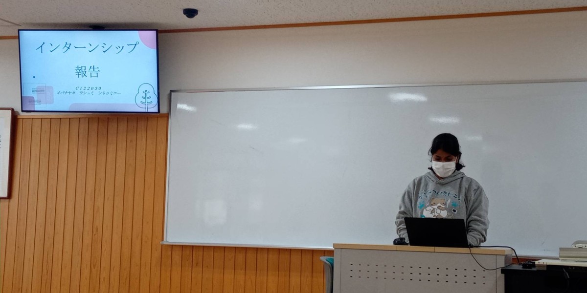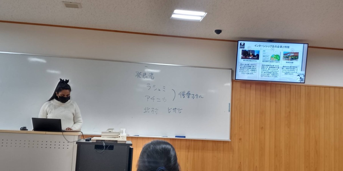 11月4日(火)、企業インターンシップ報告会を外国学科のある岡山キャンパス講義室で実施し、教職員並びに学生が参加しました。まず、スリランカの留学生2名は、市内の後楽ホテルで2週間にわたるインターンシップを経験しました。フロント業務からレストラン、ベッドメークまで幅広い経験をした。こだわりの岡山県産食材をレストランで提供されているそうですがその生産地まで行ったそうです。すべてが初めてで最初は戸惑ったようですが、ホテルスタッフのみなさんが親切に、そして、ていねいに業務を指導していただいた。8月の暑い中、毎日通うことは大変だったけど、最後までやり遂げた「達成感」は得難い経験とのことです。インターンシップを通じて、2人の留学生は、日本の「おもてなし」の精神に触れることができたと語っています。