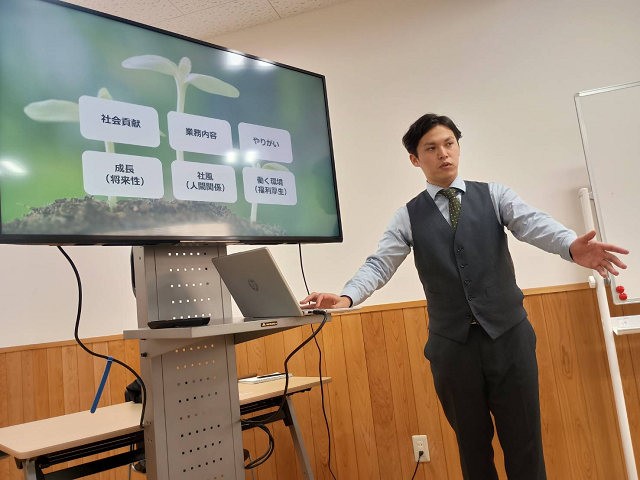 この日は、同社採用担当者から、詳細な事業内容や同社の強み、魅力などが説明されました。「からだを動かすことが好きな人、自分で考えて自ら動ける人を求めています。景気に左右されにくい安定性が強みで、個人のきちんと見ている会社です。」と学生らにメッセージが送られました。