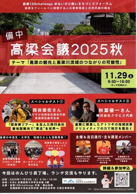 吉備国際大学社会科学部 経営社会学科 大西正泰研究室は、高梁100challenge(代表 横山弘毅)と共催で、2025年11月29日(土)に「備中高梁会議2025秋」を、吉備国際大学高梁キャンパス内の学生会館KIUB(キューブ)の2階にて開催しました。
