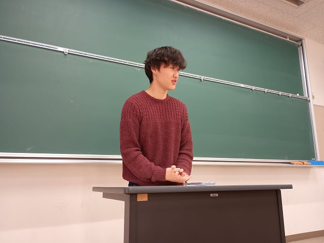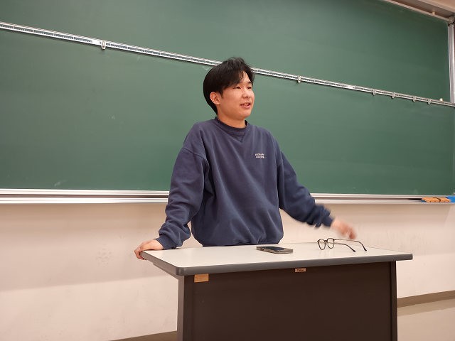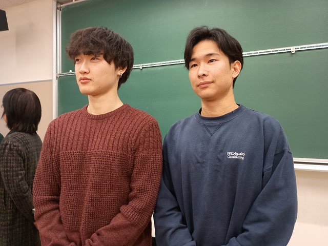 この日は、2名の4年生(陰山 太一さん、八尾 康生さん)が登壇し、いつから就活を開始したのか、どんな準備をしたのか、就職試験はどんな内容だったのかといったことを語りました。