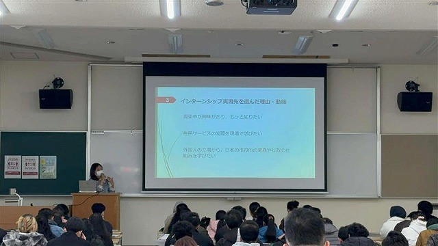 この科目を履修した3・4年生4人が、授業の一環として高梁市役所や高梁市図書館でインターンシップ研修に取り組みました。2025年12月18日にインターンシップ報告会を開催し、インターンシップ研修に参加した学生が、インターンシップ研修をつうじて学んだことや研修に参加して理解を深めたこと、今後の展望について発表しました。インターンシップ研修に参加した学生は一様に、仕事に取り組む姿勢として、施設利用者や住民の立場になって丁寧に対応するとともに、職員同士が協力するために相手の話をしっかりと耳を傾けてコミュニケーションを図ることが大切であることを強く実感し、働くうえで相手の目線で物事を見て考えることの重要性を再認識したようです。また、自分が考えた企画が形になることに喜びや達成感を感じるなど、自分の適性を知ることができたようです。