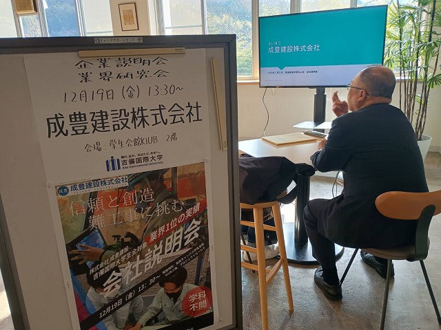 12月19日(金)、高梁キャンパス学生会館「KIUB(キューブ)」2階を会場に、成豊建設株式会社様よる企業説明会・業界研究会を開催しました。
