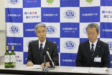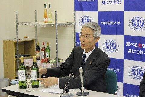 吉備国際大学では、岡山県赤磐市にある(株)是里ワイン醸造場との産学連携により、大学ブランドワインの開発をすすめてまいりました。3月1日、同醸造場において、赤磐市関係者とともに、このたび完成した試作品を集まった報道陣に披露しました。