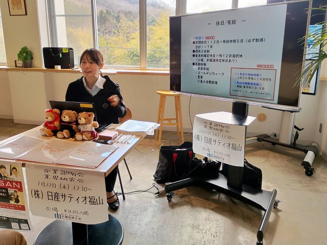 1月22日(木)、高梁キャンパス学生会館「KIUB(キューブ)」2階を会場に、株式会社日産サティオ福山様による企業説明会・業界研究会を開催しました。