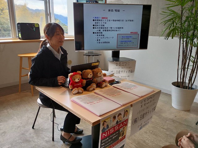 この日は、同社人事総務部の担当者による、同社の社員による各部門の仕事内容がわかる動画とともに同社における販売商品のこだわりや特徴など、詳細な説明が行われました。