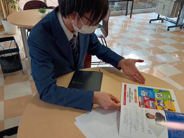 就職活動が本格化する直前のこの時期に、就活準備を頑張る3年生に向けて、今後知っておくべき情報を届けるために、今回のイベントは行われました。この日は、マイナビ社の就職情報事業本部スタッフ2名が来訪、学生らに声掛けし、今後のイベント案内やスマートフォンのマイナビアプリの新機能の紹介や使い方などを説明しました。説明を聞き終えた学生には、マイナビ社の方から、就活応援グッズとして、業界地図やドリンクが手渡されました。受け取った学生らは、いよいよ迫ってきた就活本番に向け、今後のスケジュールを確認するなど、これからの進路選択に向けて備えを始めている様子がうかがえました。