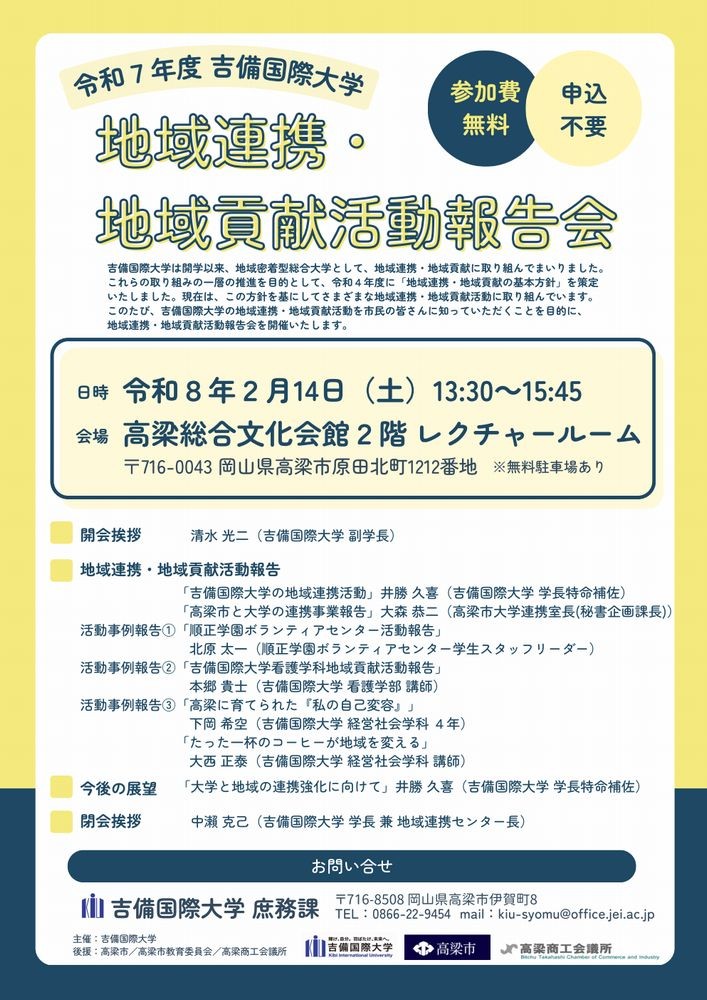 このたび、吉備国際大学の地域連携・地域貢献活動を市民の皆さんに知っていただくことを目的に、地域連携・地域貢献活動報告会を開催いたします。