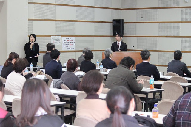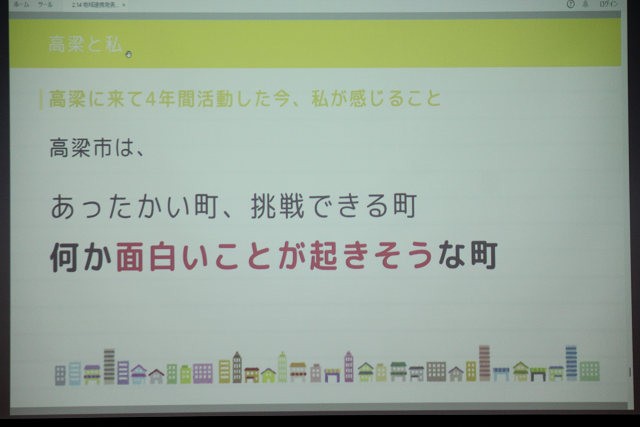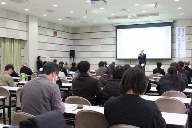 この日の報告会には、石田芳夫 高梁市長そして福本和宏 高梁市教育長らおよそ50人が、吉備国際大学の地域連携活動や活動事例、高梁市と大学の連携事業などの報告に耳を傾けました。