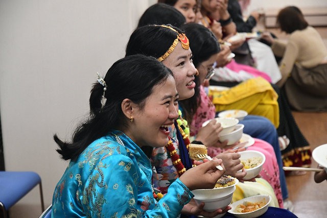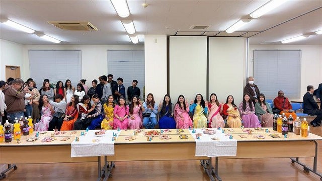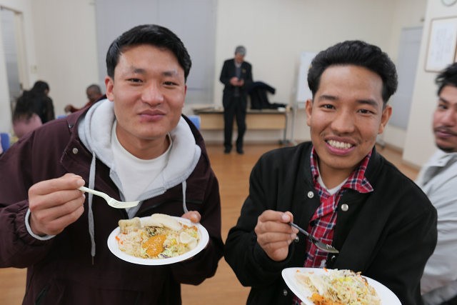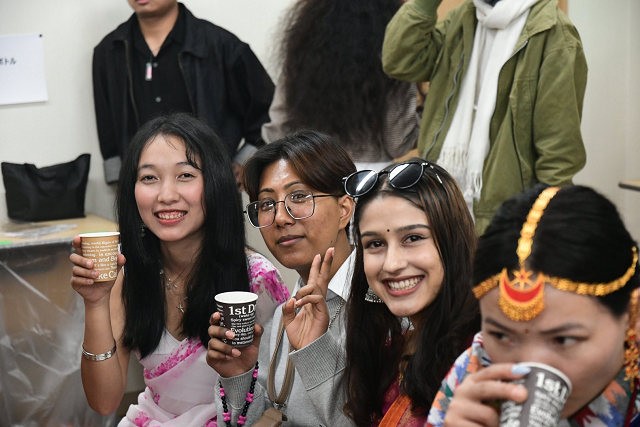 会場のテーブルには、留学生たちが腕を振るった母国の代表料理が並びました。インドネシアのナシゴレン、ネパールのモモ(蒸し餃子)、スリランカのチキンカレーやフライドライス、ミャンマーの伝統菓子サヌイマキンのほか、日本のお好み焼きや白玉ぜんざいなど、さまざまな国の料理が振る舞われ、その本格的な味わいに参加者からは歓声が上がりました。