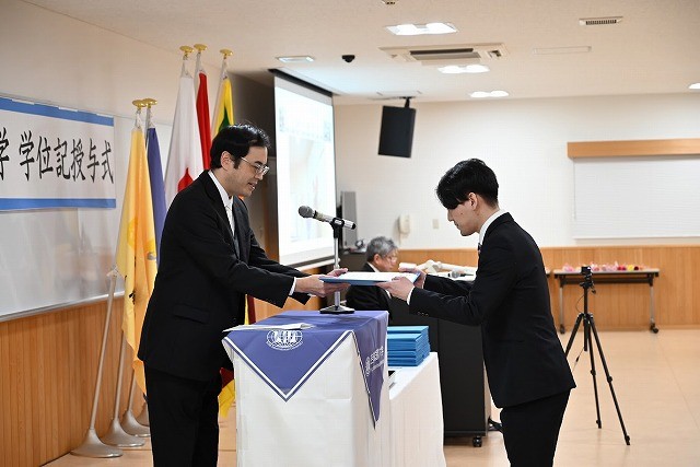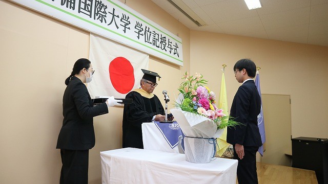 そして、学園創立者加計勉名誉理事長の名を冠した「加計勉賞」(在学中、特に優秀な成績を修め、人物ともに優れ、他の模範となった卒業生)が、順正学園 加計理事長から、農学部地域創成農学科 岡崎英也さんに授与されました。次に、幕末の偉大な教育・経世家として藩政改革を成し遂げ、子弟の教育に当たった山田方谷の名を冠した「方谷賞」(山田方谷の偉業を称えるとともに、多くの先覚者を全国に輩出した高梁市の歴史的風土や伝統を後世に守り伝えるため、高梁市長が特に優秀な学生を方谷賞として顕彰し、その努力を称える)が、高梁市 石田芳生 市長から、社会科学部経営社会学科 金高まりあさんと、アニメーション学部アニメーション学科 シリラタナ バンダラワッテ ゲダラ サマダラ チャンダラマリーさんに授与されました。また、南あわじ市長賞(農学部において、地域創成の理念のもと、在学中における学業、文化、スポーツ活動、ボランティア等を通じた地域連携に積極的に取り組み、且つ、学業成績が優秀な学生を称える)が、南あわじ市 守本憲弘 市長から、農学部醸造学科 長谷川悠都さんに授与されました。