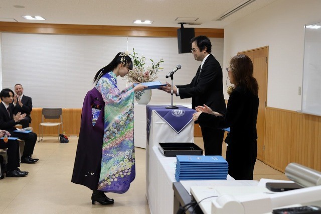 式では、まず中瀨学長から各学部および大学院研究科の代表生に学位記が授与されました。
