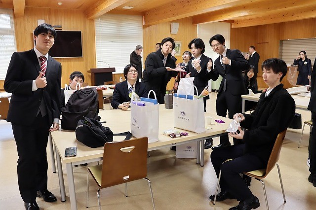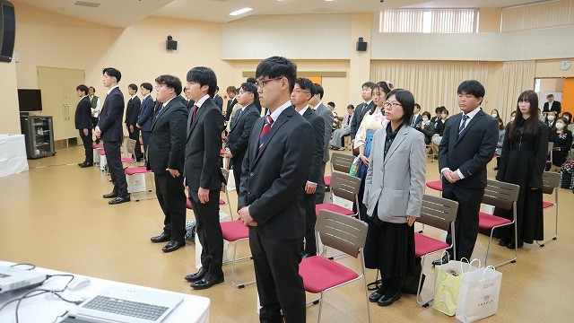 その後、卒業生を代表し、心理学部心理学科 福田拓海さんが「こうして謝辞を述べることができるのは、先生方をはじめ、両親、大学生活で出会った友人、先輩後輩、たくさんの人が私を支えてくれたおかげです。この四年間、大学で楽しく過ごすことができたこと、かけがえのない友人たちと出会えたこと、日々の活動で今までにない経験ができたこと、そして自分自身が大きく成長できたと感じられるのは、決して自分の力だけではなく、皆さんがいてくれたからです。この4年間で培った絆と経験を胸にそれぞれの道を力強く歩んでいきたい」と感謝のことばを述べました。