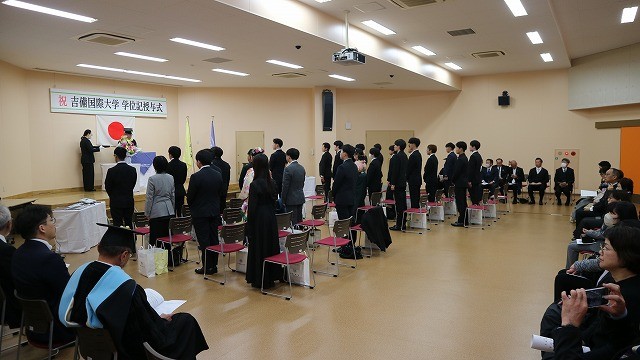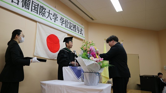 学位記授与式は、高梁キャンパス・南あわじ志知キャンパス・岡山キャンパスの3キャンパスをオンラインによるライブ映像で結んで行い、学生たちは、4年間を過ごしたそれぞれのキャンパスで、式に臨みました。