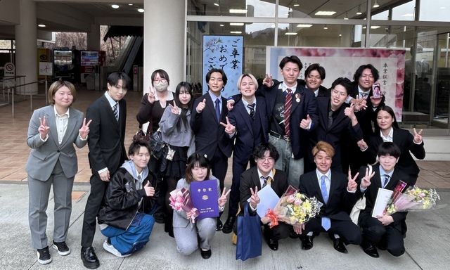 学位記授与式には、昨年卒業した先輩も駆けつけてくれ(ありがとう)、参集した後輩部員は、先輩に色紙や花束を渡し、笑顔で別れを惜しんでいました。「ご卒業おめでとうございます」に続く言葉は、後輩らの熱い思いがあふれていました。