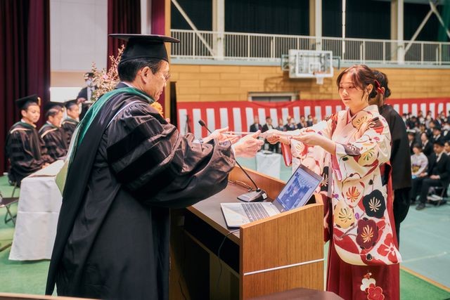 式典では、中瀬学長から学部生・大学院生の代表者に学位記が授与されたのち、「皆さんはこの4年間で、自ら課題を見つけ解決する力を備えました。大学は卒業して終わりではありません。これからも挑戦し続ける姿勢を大切にしてください」とはなむけの言葉が贈られました。また、加計理事長からも「私たちに与えられた人生は一度きりです。高い志、大きな夢を持ってひるむことなく挑戦をし続けてください」と力強いエールが送られました。