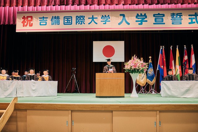 中瀨学長から427名の入学が許可されると、新入生を代表しアニメーション学科 安藤さんが「吉備国際大学生としての自覚と高い志を持って、国際社会の期待にこたえることができるように日々精進することを誓います」と宣誓しました。