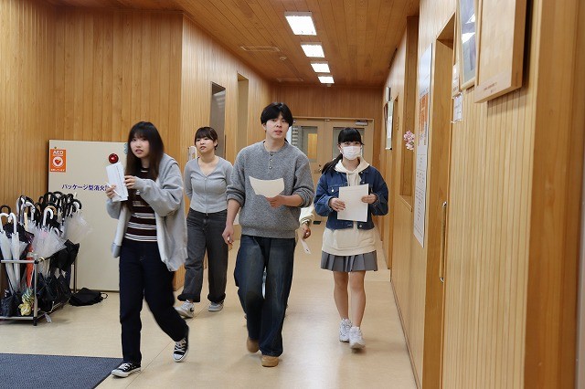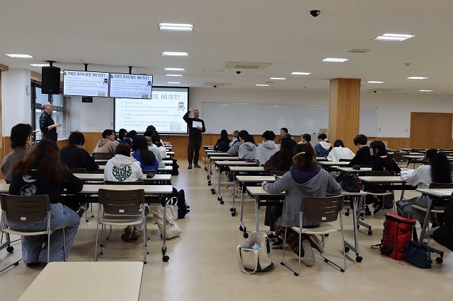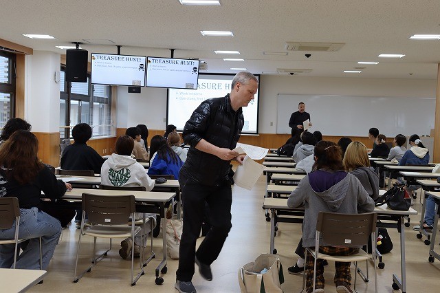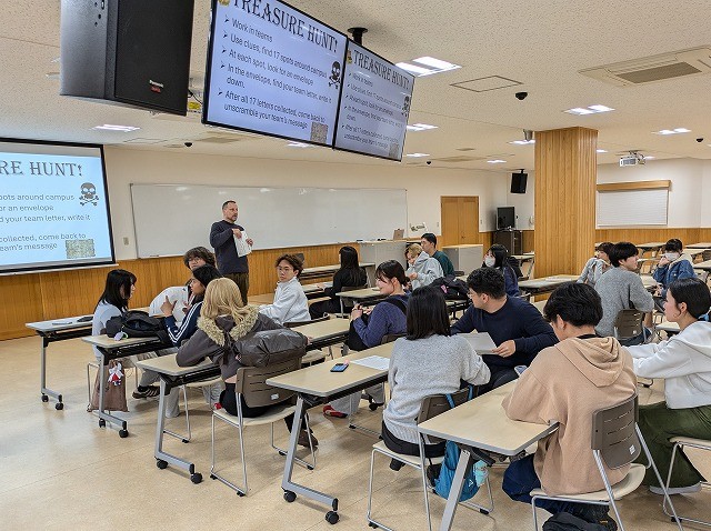 大講義室に集合。最初に、ポール先生からイベントの趣旨、ゲーム”Treasure Hunt(宝探し)”のルールと内容が説明されました。その上で、全体を6グループに分け、各グループに課題シートと記録紙が配布され、グループ内で作戦を相談し、各グループがキャンパス内に散っていきました。指定された場所を探し、その場所にある封筒を見つけ、封筒の中に各グループのアルファベット1文字が書いてあるので、それを書きとる。そして、次の指定場所に向かうというものです。指定場所が17ヶ所ありました。最後のアルファベットを書くと、全部で、17文字が集まります。出発地点に戻り、各グループごとに、シートが配布され、17文字を使って、文章をつくるというタスクが待っていました。グループ内で力を合わせ、17文字を4~5単語に分けて文章にする。そして、英語教員が解答を確認して終わりになります。確認を終えた早い順に順位が決まりました。