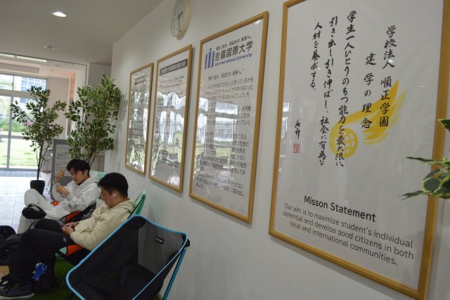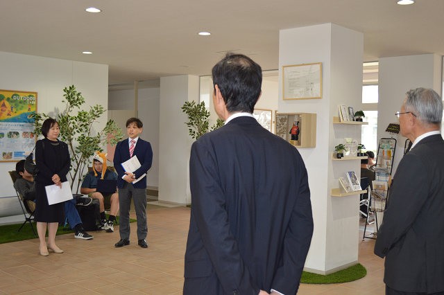 起工式の後は、順正学園教育後援会の特別援助金により整備されたエントランスや自修道場などの見学を行いました。なお、エントランスには、昨年に包括協定を締結したモンベル社のアウトドアファニチャーなどが配置されています。