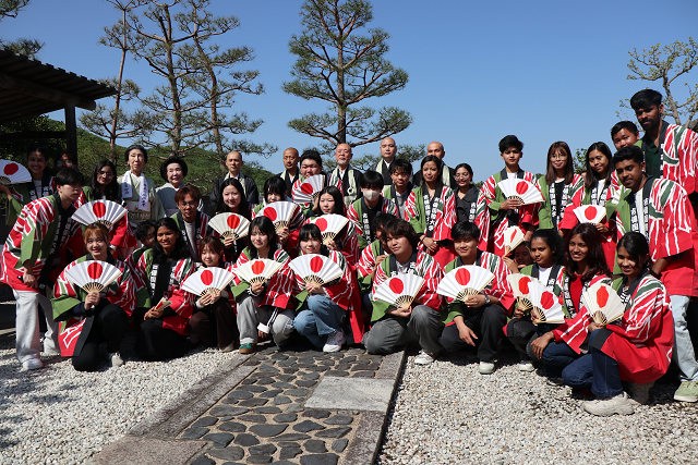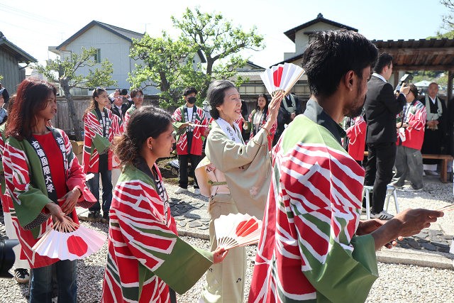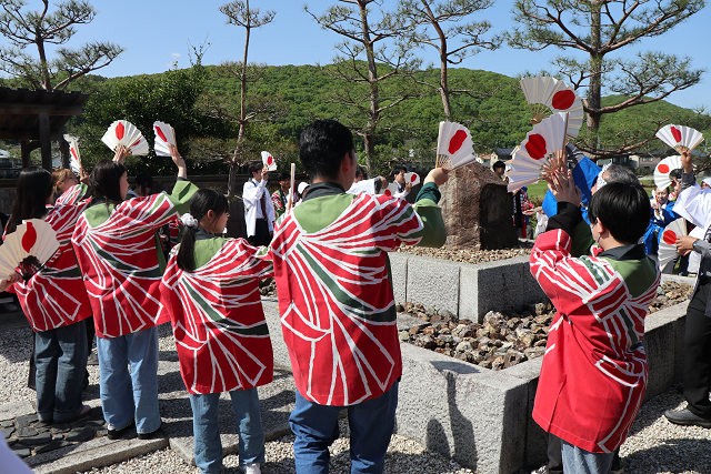 4月25日(土)、岡山市北区にある栄西禅師の生誕地にて、臨済宗建仁寺派 川本博明 宗務総長による栄西禅師の御法要を執り行った後、法被姿の外国学科1年生が中心で、浴衣姿の地域住民の皆様と一緒に、およそ70名が石碑のまわりを輪になって、栄西踊りを奉納しました。