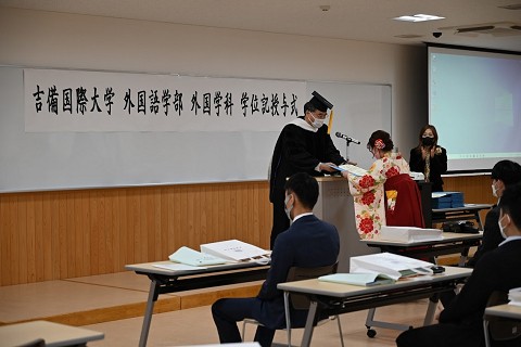 今年度の学位記授与式は、昨年度と同様に、新型コロナウイルス感染症拡大予防のため、卒業生全員が体育館に一堂に会することを避け、吉備国際大学の3キャンパス(高梁・南あわじ志知・岡山)で、学科・研究科単位ごとに、各教室に分散し、卒業生と教職員のみ(来賓および家族、関係者の出席は無し)で実施しました。