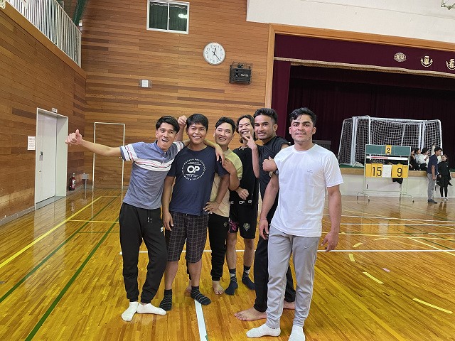 春入学の学生と秋入学の学生の混成チームは国籍もバラバラで、知らない者同士でしたが、思いっきり体を動かしているうちにみな仲良くなりました。男子チームの決勝戦は大接戦となり、15対17で(15点取った方が勝ちというルールで行いましたが、同点になり、2点先に入れた方が勝ちで)決着がつきました。