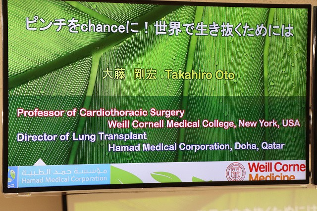 この日は、米国コーネル大学医学部心臓胸部外科教授でカタール国ハマド・メディカル・コーポレーション肺移植センター長 大藤剛宏(おおとうたかひろ)先生が、「ピンチをchance!に世界で生き抜くためには」と題して、授業が行われました。