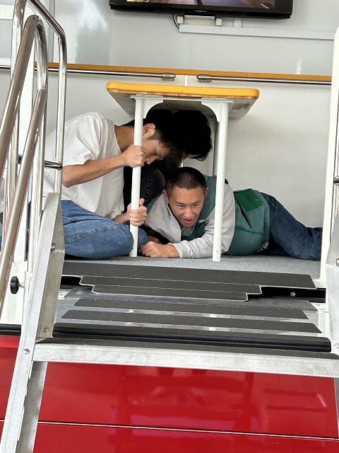 留学生さんの母国は「地震がないから、楽しみ」と言って参加しましたが、参加後は「これが地震」と激しい揺れに驚いていました。普段からできる防災行動や知識を一緒に確認しました。