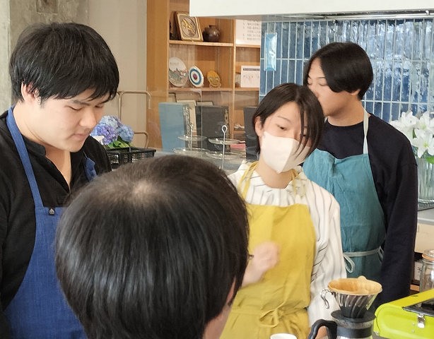 ▲カウンターでフリーコーヒーの準備をする後輩にアドバイスをする4年生の先輩、下岡希空さん(右端)