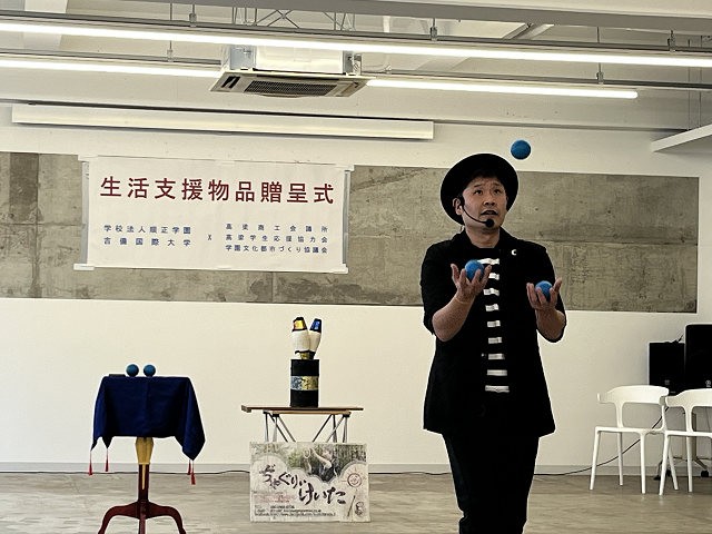 生活支援物品の贈呈後は、石田高梁市長もご参加いただき、高梁商工会議所と高梁学生応援協力会主催による「交流会」が開かれ、おもてなしのオードブルを頂きながらの歓談、ネパール出身の留学生ダヌカ・チャンダさんの民族舞踊や各種イベントで活躍されている大道芸師ぢゃぐりぃけいた氏のパフォーマンスを楽しみ、和やかなひとときを過ごしました。