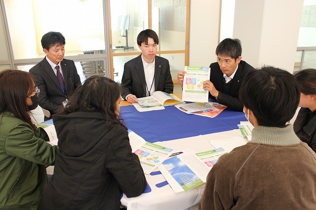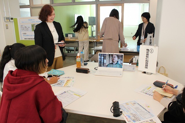 11月10日(月)、会場となった高梁キャンパスの「学生会館KIUB(キューブ)3階 ラーニングコモンズ」には、8社の企業担当者と1~3年の学生ら合わせて約60名が集まりました。会はまず、岡山県産業労働部労働雇用政策課 内 裕子 様の挨拶からスタートしました。学生らは8社の中から希望する企業ブースに着席し、1ターン25分で説明を聞きました。各ターン終了後には、ブースを移動し次の会社説明を聞くというもので、合計4ターン行いました。
