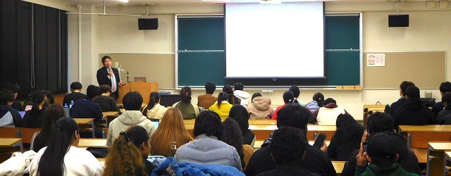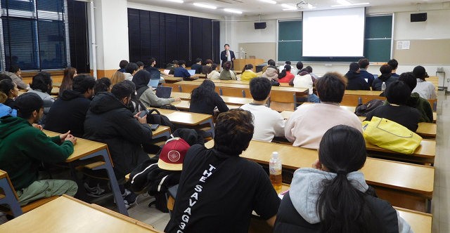 ▲特別講義中の授業風景 当日は68名の学生が聴講