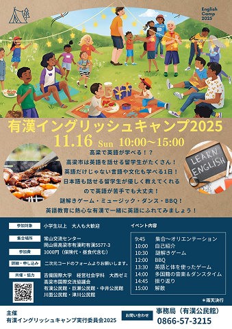 吉備国際大学社会科学部経営社会学科・大西正泰研究室では、11月16日(日)に高梁市有漢地域で4年目となる「有漢イングリッシュキャンプ2025」(主催 有漢イングリッシュキャンプ実行委員会2025)を開催しました。このイングリッシュキャンプは、有漢公民館を中心とした5つの公民館と高梁市国際交流協議会の協力のもとで行われました。当日は小学生から大人まで幅広い世代が参加し、学生・地域・留学生が一体となって学びと交流を生み出す一日となりました。