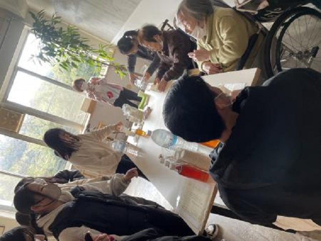 学生会館のブースには、経営社会学科や作業療法学科の学生、施設利用者の方、そして看護学生が一緒に集まり、世代や立場をこえてゆったりとした交流の時間が流れていました。