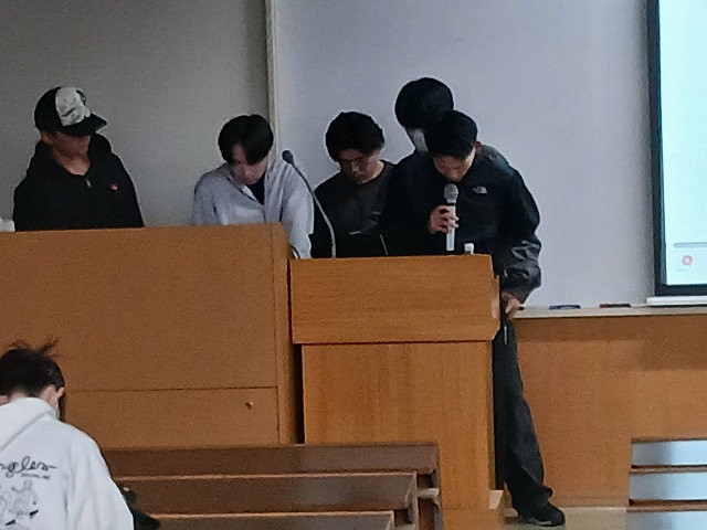 最後に、本授業の担当教員である畝先生(外国学科)並びに木村先生(アニメーション学科)から講評がありました。「短い期間でよく調べ、発表の準備をしたことが、良く分かった。素晴らしかった!」と良いコメントがあった一方、「もう少し読み上げ練習を徹底していれば、もっと良い発表になった。惜しかった。次回の発表に期待します。」との辛口コメントもありました。
