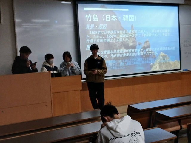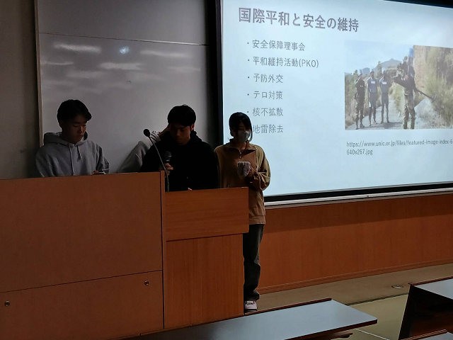 これまで、国境、国家、国際法、国際連合、人権などを学んできました。それらを踏まえ、グループで発表をするわけですが、発表のテーマは、多岐にわたっています。発表においては、チームワークが発揮されました。説明者の個性が前面に出た発表もあれば、チームワークで発表を乗り切ったグループなど、様々でした。発表内容に感心したり、驚きがあり、笑いがあり、楽しくも有意義な90分間でした。