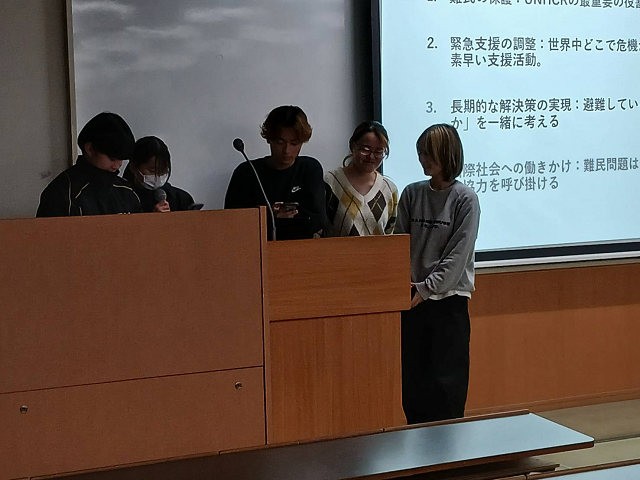- 今回の発表の中でUNHCRについての発表に一番興味が湧いた。日常生活では難民問題を身近に感じることが少ないため、普段想像できないような厳しい環境で生きている人が世界中に多く存在することに衝撃を受けた。UNHCRが支援を行っている難民の多くは、最終的に母国に帰ることができるのかが気になった。
