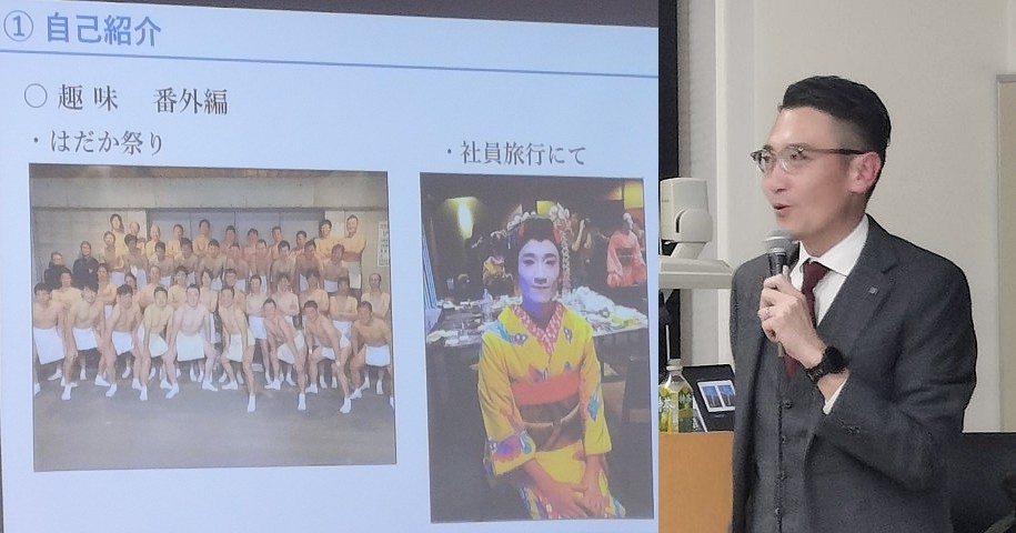 ▲自己紹介では、日本三大奇祭の一つ「西大寺会陽(さいだいじえよう)」はだか祭りに参加されている写真や、社員旅行での女装した姿もご紹介頂きました。