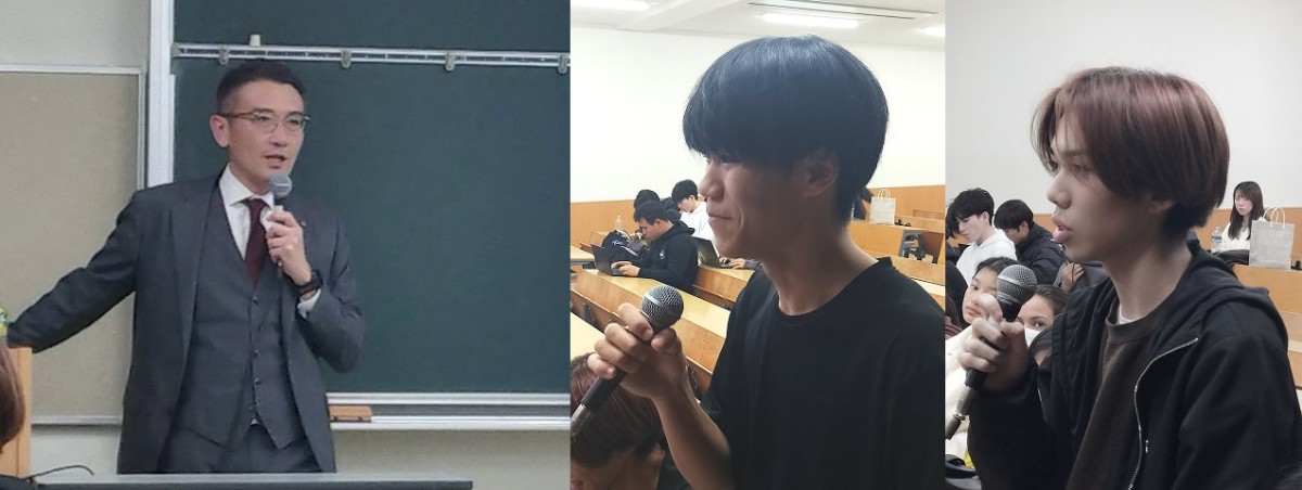▲質問に答える高山社長(左)、質問する学生は左から“小谷亮太”さん、“千葉太耀”さん