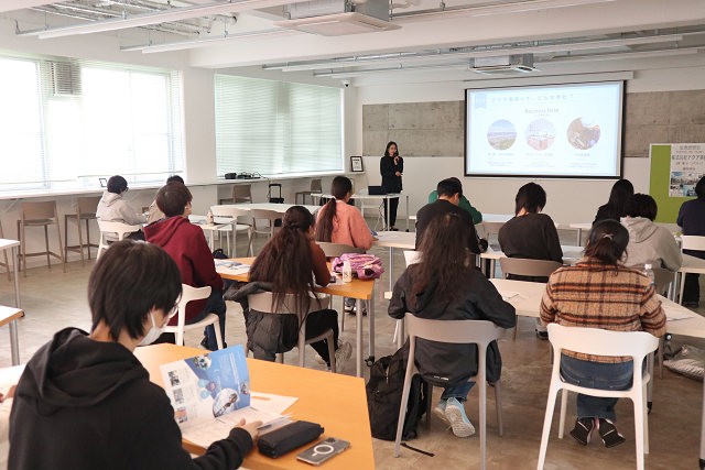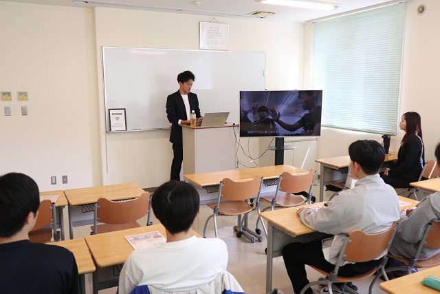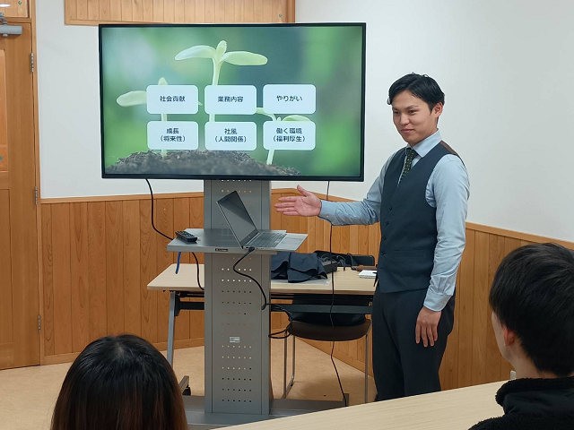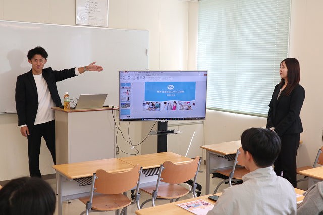 この日は、同社採用担当者から、詳細な事業内容や同社の強み、魅力などが説明されました。「からだを動かすことが好きな人、自分で考えて自ら動ける人を求めています。景気に左右されにくい安定性が強みで、個人のきちんと見ている会社です。」と学生らにメッセージが送られました。